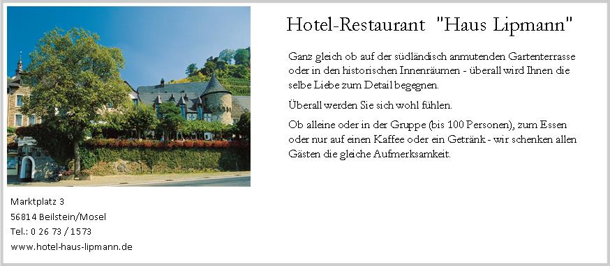 | Restaurant "Altes Zollhaus" Moselstrasse | Tel. 02673/1850 Fax: 02673/1287 | www.hotel-lipmann.de lipmann@t-online.de |