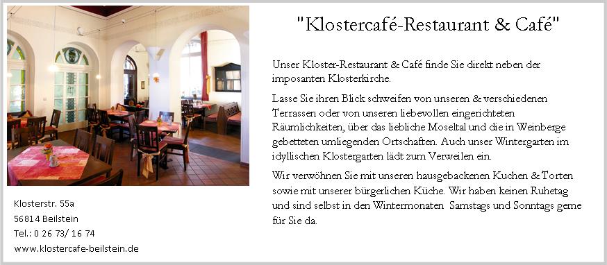| Klostercafé-Restaurant | Tel.: 02673/1653 Fax: 02673/1688 | www.klostercafe-beilstein.de klostercafe-beilstein@t-online.de |